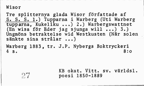 //// Wisor //// Tre splitternya glada Wisor författade af S. S. S. 1.) Tupparna i Warberg (Uti Warberg tupparna, Kukeliku ...) 2.) Warbergswattnet CEn visa för Eder jag sjunga will ...) 3.) Ungmöns betraktelse vrid Westkusten (När solen sänkte sina strålar ...) //// Warberg 1883, tr. J.P. Nybergs Boktryckeri 4 s. 8:o //// KB okat. Vitt. sv. världsl. //// 27 poesi 1850-1889 ////