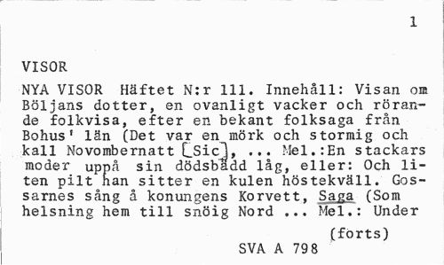 //// 1 //// VISOR //// NYA VISOR Häftet N:r 111. Innehåll: Visan om Böljans dotter, en ovanligt vacker och rörande folkvisa, efter en bekant folksaga från Bohus' län (Det var en mörk och stormig och kall Novombernatt Csicl, ... Mel.:En stackars moder uppå sin dödsbädd låg, eller: Och liten pilt han sitter en kulen höstekväll. Gos-sarnes sång å konungens Korvett, Saga (Som helsning hem till snöig Nord ... Mel.: Under //// (forts) //// SVA A 79 8 ////