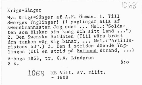 //// r. löbsr //// Krigs=Sanger //// Nya Krigs=Sånger a£ A.F. öhman. 1. Till Si^erges Ynglingar! (I ynglingar alla af swenskmannastam Jag eder ... Mel.:"Soldaten som älskar sin kung och sitt land ...") 2. Den Swenska Soldaten (Till wåra bröst den tanken wäg sig banar, ... Mel"Artilleristens ed".) 3. Den i striden döende Yng-lingan (Uti en strid på Saimens strand. ...) //// Arboga 1855, tr. G.A. Lindgren 1 8 s.' 8:o //// 1 Qfttf KB Vitt. sv. milit. - 1900 ////