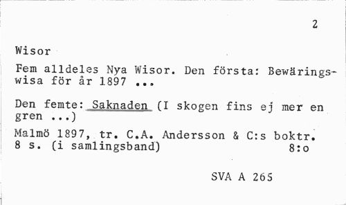 //// 2 //// Wisor //// Fem alldeles Nya Wisor. Den första: Bewärings-wisa för år 1897 ... //// Den femte: Saknaden fl skogen fins ej mer en gren ...) //// Malmö 1897, tr. C.A. Andersson & C:s boktr. 8 s. (i samlingsband) 8:o //// SVA A 265 ////