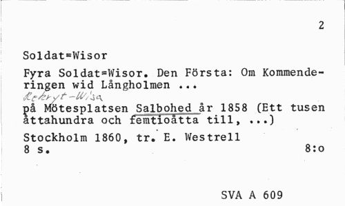 //// 2 //// Soldat=Wisor //// Fyra Soldat=Wisor. Den Första: Om Kommende-ringen wid Långholmen ... //// |>å Mötesplatsen Salbohed år 1858 (Ett tusen attahundra och femtioåtta till, ...) //// Stockholm 1860, tr. E. Westrell 8 s. 8:o //// j SVA A 609 ////