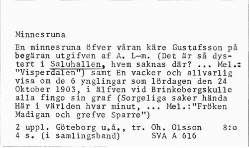 //// Minnes runa //// En minnesruna öfver våran käre Gustafsson på begäran utgifven af A. L-m. (Det är så dystert i Saluhallen, hvem saknas där? ... Mel.: "Visperdaren") samt En vacker och allvarlig visa om de 6 ynglingar som lördagen den 24 Oktober 1903, i älfven vid Brinkebergskulle alla fingo sin graf (Sorgeliga saker hända Här i världen hvar minut, ... Mel.:"Fröken Madigan och grefve Sparre") //// 2 uppl. Göteborg u.å., tr. Oh. Olsson 8:o 4 s. (i samlingsband) SVA A 616 ////
