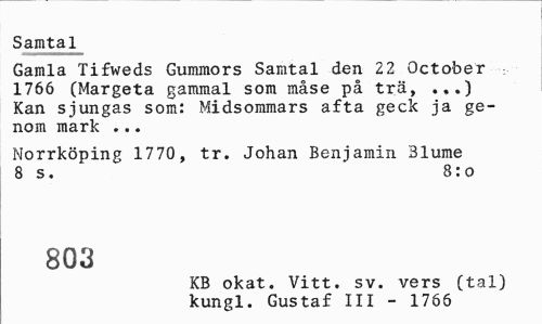 //// Samtal //// Gamla Tifweds Gummors Samtal den 22 October 1766 (Margeta gammal som måse på trä, .,.) Kan sjungas som: Midsommars afta geck ja genom mark ... //// Norrköping 1770, tr. Johan Benjamin Blume 8 s. 8:o //// 803 //// KB okat. Vitt. sv. vers (tal) kungl. Gustaf III - 1766 ////