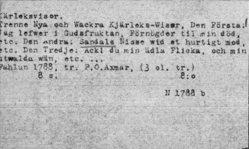 //// ;ärleksviaer. j //// !renne Nya oeh Wackra Kjärleks-Wis»r, Der. Första;' "Äg lefwer i 3udefruktan, Fcrnögder til ir.in död, >tc. Den ^ndra; Sandals ftiase wid et hurtigt mod, !te. Den Tredje; "^acFFTu min ädla Flioka, och min itwalda wän, etc, ... //// i*ahlun 1785, tr. P.O.Axnar, (3 ol. tr.) //// 8 s. , B:o //// U 1788 b //// * ' ' . 'i * > ////