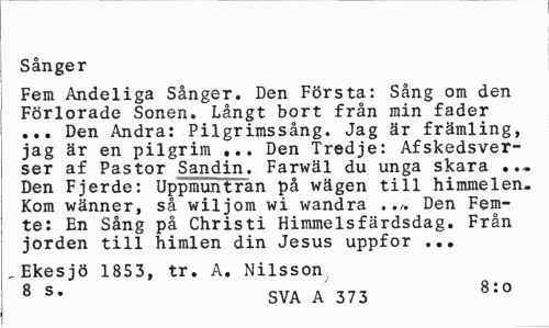//// Sånger //// Fem Andeliga Sånger. Den Första: Sång om den Förlorade Sonen. Långt bort från min fader ... Den Andra: Pilgrimssång. Jag är främling, jag är en pilgrim ... Den Tredje: Afskedsver-ser af Pastor Sandin. Farwäl du unga skara ... Den Fjerde: Uppmuntran på wägen till himmelen. Kom wänner, så wiljom wi wandra ../. Den Femte: En Sång på Christi Himmelsfärdsdag. Från jorden till himlen din Jesus uppfor ... //// , Ekesjö 1853, tr. A. Nilsson //// 8 S* SVA A 373 8:0 ////