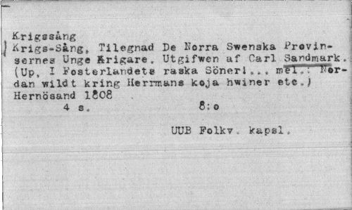 //// Krigssång //// | Krigs-Sång, Tilegnad De Korra Swenska Provin» //// sernes Unge Rrigare, Utgifwen af Carl Sandmark. //// (Up, I Fosterlandets raska Sönerl„», .: nordan wildt kring Herrmans koja hwiner etc,; Hernösand 1808 //// 4 s. 8; o //// UUB Folkv. kapsl. ////