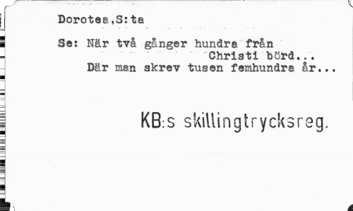 //// Dorotea,S:ta //// i Se: När två gånger hundra från //// Christi börd... Där man skrev tusen femhundra år... //// J i //// I KB:S skillingtrycksreg. ////