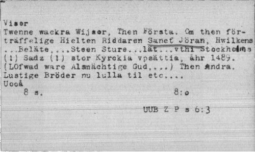 //// v i» sr //// Twenne wackra Wi.jsor, Xhen -törsta, Qaa then förträff elige Hielten Riddaren 3anet* J öran, Hwilkens . . .Belate , . ,.Steen Sture . . .lal „'". . TihiTSt ockholins (l) 3ada (lj stor Kyrckia vpsättia, ähr 148?. (LOf w&d ware Alsmächti^e Gud,,,,) Then Andra. Lustige Bröder nu lulla til etc... Uoca //// 8 s. 8:0 //// UUB Z P s b: 3 ////