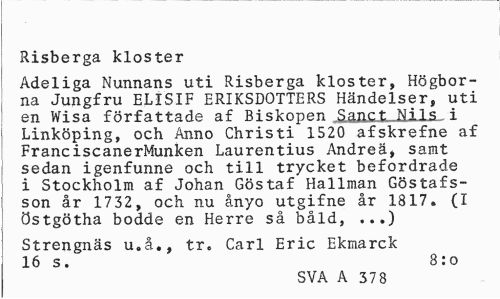 //// Risberga kloster //// Adeliga Nunnans uti Risberga kloster, Högborna Jungfru ELISIF ERIKSDOTTERS Händelser, uti en Wisa författade af Biskopen S^nct Nils i Linköping, och Anno Christi 1520 afskrefne af FranciscanerMunken Laurentius Andreä» samt sedan igenfunne och till trycket befordrade i Stockholm af Johan Göstaf Hallman Göstafs-son år 1732, och nu ånyo utgifne år 1817. (I östgötha bodde en Herre så båld, ...) //// Strengnäs u.å., tr. Carl Eric Ekmarck 16 s. 8:o //// SVA A 378 ////