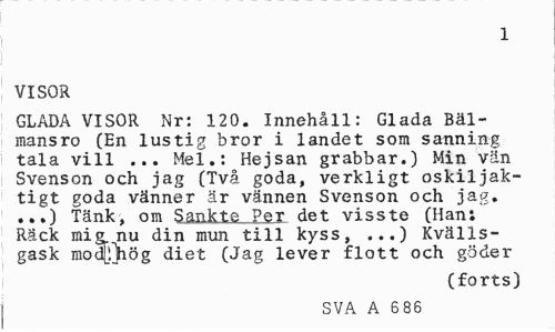 //// 1 //// VISOR //// GLADA VISOR Nr: 120. Innehåll: Glada Bäl-mansro (En lustig bror i landet som sanning tala vill ... Mel.: Hejsan grabbar.) Min vän Svenson och jag (Två goda, verkligt oskiljaktigt goda vänner är vännen Svenson och jag. ...) Tänk, om Sankte Per det visste (Han; Räck mig. nu din mun till kyss, ...) Kvälls-gask mod[i]hög diet (Jag lever flott och göder //// (forts) //// SVA A 6 86 ////