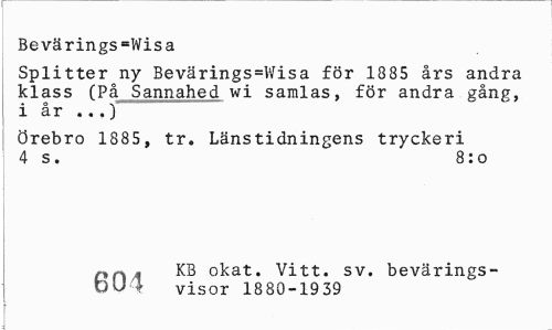 //// Bevärings=Wisa //// Splitter ny Bevärings=Wisa för 1885 års andra klass (På Sannahed wi samlas, för andra gång, i år ..,) //// Örebro 1885, tr. Länstidningens tryckeri 4 s. 8:o //// f„r , KB okat. Vitt. sv. bevärings- //// bU4 visor 1880-1939 ////
