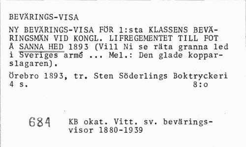 //// BEVÄRINGS-VISA //// NY BEVÄRINGS-VISA FÖR lista KLASSENS BEVÄ-RINGSMÄN VID KONGL. LIFREGEMENTET TILL FOT A SANNA HED 189 3 (Vill Ni se räta granna led i Sveriges armé ... Mel.: Den glade kopparslagaren) . //// Örebro 1893, tr. Sten Söderlings Boktryckeri 4 s. 8: o //// Bl 6 okat. Vitt. sv. bevärings- //// visor 1880-1939 ////