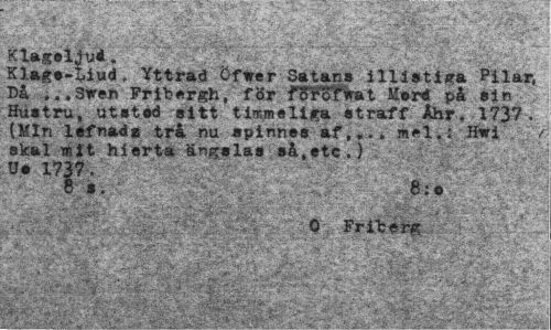 //// Klags-tiud. Yttrad 'Öfwer Satans illistiga Pilar, Då ,..Swen Fribergh, för foWfwat Msrd på sin-. Hustru, utstéd sitt timmeliga straff Ähr. 1737. (Min lefnada tri nu »pinnes .., mel.; Hwi t skal tn i t hierta ängslas så,etc.) //// U# 17|7s P //// • Ä 1 Ö, Friberg I i //// ¦ i B Mm i ////
