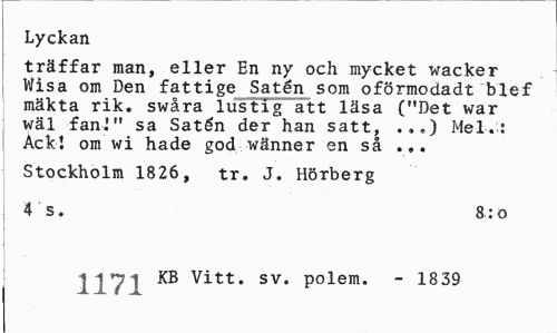 //// Lyckan //// träffar man, eller En ny och mycket wacker Wisa om Den fattige Saten som oförmodadt blef mäkta rik, swåra lustig att läsa ("Det war wäl fan."' sa Satén der han satt, .,.) Mel.: Ackl om wi hade god wänner en så ... //// Stockholm 1826, tr. J. Hörberg 4 s. 8:0 //// 1171 KB Vitt* sv# Polem« ~ 1839 ////