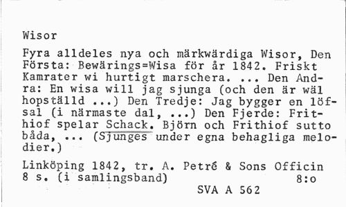 //// Wisor //// Fyra alldeles nya och märkwärdiga Wisor, Den Första: Bewärings=Wisa för år 1842. Friskt Kamrater wi hurtigt marschera. ... Den Andra: En wisa will jag sjunga (och den är wäl hopställd ...) Den Tredje: Jag bygger en löf-sal (i närmaste dal, ...) Den Fjerde: Frit-hiof spelar Schack. Björn och Frithiof sutto båda, ... (Sjunges under egna behagliga melodier.) //// Linköping 1842, tr. A. Petré & Sons Officin //// 8 s. (i samlingsband) 8:o //// SVA A 56 2 ////