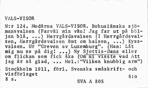 //// VALS-VISOR //// N:r 124. Modärna VALS-VISOR. Bohuslänska sjömansvalsen (Farväl min vän.' Jag far ut på böljan blå, .) Herrgårdsvalsen (I Herrgårdsvalsen, Herrgårdsvalsen ömt om halsen, ...) Kyssvalsen. Ur "Greven av Luxemburg". (Han: Låt mig nu se på digl ...) Ny Sjottis-Dans eller om flickan som fick åka (Om ni visste vad Att jag är så glad, ... Mel.:"Vilken knubbig arm") //// Stockholm 1911, förl. Svenska småskrift- och visförlaget 8:o //// 8 s* SVA A 805 ////