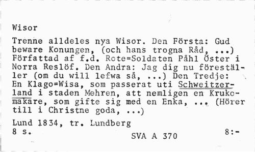 //// Wisor //// Trenne alldeles nya Wisor. Den Första: Gud beware Konungen, (och hans trogna Råd, ,..) Författad af f.d. Rote=Soldaten Påhl öster i Norra Reslöf. Den Andra: Jag dig nu föreställer (om du will lefwa så, ...) Den Tredje: En Klago=Wisa, som passerat uti Schweitzer-land i staden Mehren, att nemligen en Krukc-makare, som gifte sig med en Enka, ... (Hörer till i Christne goda, ...) //// Lund 18 34, tr. Lundberg //// 8 s* SVA A 370 8:" ////