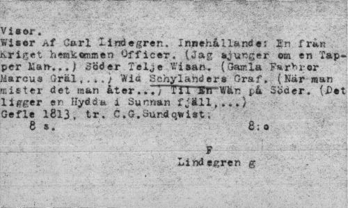 //// /i«er. .. //// wisor Af Carl Lindegren. Innehållande: frinn vridet hemkommen Officer. (Jag sjunger om en Tapper liam..) Söder Telje V/isan. (Gamla Farhror tearcus Gräl, . ..} Wid Schylanders Graf, (När man Bister det man åter...; Til JSflTW&n på Söder. (Det ligger en Hydda i Swnnan fjäll,...} Gefle 1813, tr. C.G.Sundqwist; //// e ». 8:0 //// - .--v.'- \ * $ -* ¦'¦ 'V.-'" //// Lindegren g ////
