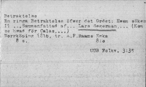 //// Betraktelse //// En ringa Betraktelse öfwer det Ordet; Hwem sökes I' ... Sammanfattad af... Lars Segeman.,... (Kom //// se r.watf för Calas,...) " "¦' ''' "r" 1... //// Norrk öp i 1 c!6 , tr» h . F, Raam a F-nka 8 s , 8; o //// UUB FolkT. 3:35 //// £/. - ' . . „\ ... _ _ , ^ • -- - ' - - ' ..; . .. ' ////