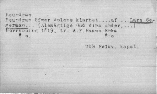 //// Beurdran //// Beurdran öfv;er dolens klarhet 4 .af . . Lars Se.- //// german. , , (Alsmä.Ttige Gud dina under., . ,77 //// K or r k'öping 1e19„ tr A„F»Raams Enka //// 8 H * O //// UUB Folkv. kapsl ////