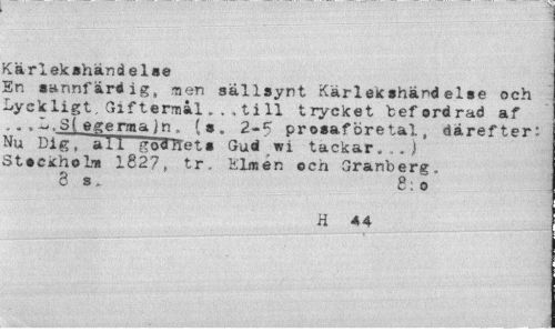 //// Kärlekshänd el se //// En sannfärdig, -nen sällsynt Kärlekshänd else och Lyckligt, Giftermål. . > ti 11 trycket befordrad af . . , L.Sj egerma in . (s. 2-5 prosaföretal, därefter: Nu Dig, all go<JlTets Gud wi tackar.,.} Stockholm 1827, tr. Klmen ocn Granberg. 8 s. g;0 //// H 44 ////