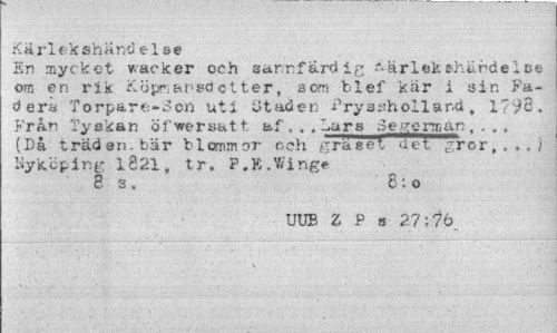 //// Kärlekshänd e-l&e //// En mycket vacker och sannfärdig kärlekshandel se om en rik Köprcansöotter, scw blef kär i sin Faders Torpare-don uti Staden Pryssholland , 17^8. från Tyskan öfwersatt af,, /Lars degerman..., (Då träden, bär blommor och gräset aet gror ,„,.,¦ Nyköping 1821, tr, P.R.Winge //// 8 s. 8:0 //// UUB Z P n 27; 76 ////