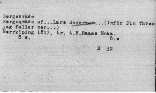 //// Sergekväde //// Ssrgeqwäde af.^.Lar» Sejyyayw*. .. (Inf ör Din Threu jag faller ner...) //// Nerrkcping 1817, tr. A.F.Rasua» Enka. 8 «. 8; • //// H 32 ////