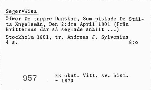 //// Seger-Wisa //// öfwer De tappre Danskar, Som piskade De Stål-ta Ängelsmän, Den 2:dra April 1801 (Från Britternas dar så seglade snällt .*.) //// Stockholm 1801, tr. Andreas J. Sylvenius 4 s. 8:o //// ncr^ KB ökat. Vitt. sv. "nist. //// ' - 1870 ////