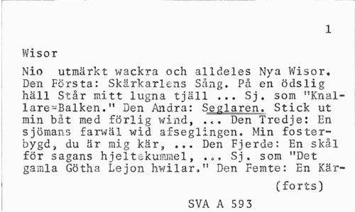 //// 1 //// Wisor //// Nio utmärkt wackra och alldeles Nya Wisor. Den Första: Skärkarlens Sång. På en ödslig häll Står mitt lugna tjäll ... S j . som "Knal-lare~-Balken." Den Andra: Seglaren. Stick ut min båt med förlig wind, ... Den Tredje: En sjömans farwäl wid afseglingen. Min fosterbygd» du är mig kär, ... Den Fjerde: En skål för sagans hjeltekummel, ... Sj. som "Det gamla Götha Lejon hwilar." Den Femte: En Kär- //// (forts) //// SVA A 59 3 ////