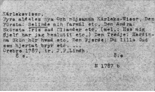 //// Kärleksvisor. //// Ityra »l«*eles nya Och nöjsamma Kärleks-Wisor , Der Första: Selinde min farwäl etc. Den Andra: Skönsta TrTs sael Cl i änder etc. (t»ei,: Hos mig gjelf har jag beslutit etc.) Den Tredje: Herdir-na 3kön hör hwad. etc. ?>en Fjerde: Du lilla 3ud ssm hjertat "bryr etc. ... Crebre 1787, tr. J.P.Lindh. //// 8 s. 8;e //// ti 1787 b ////