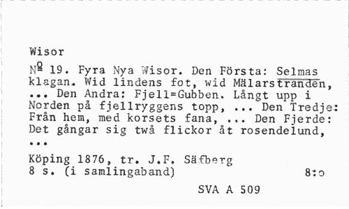 //// Wisor //// N- 19. Fyra Nya Wisor. Den Första: Selmas klagan. Wid lindens fot, wid Mälarstranden, ... Den Andra: Fjell=Gubben. Långt upp i Norden på fjellryggens topp, ... Den Tredje: Från hem, med korsets fana, ... Den Fjerde: //// Det gångar sig twå flickor åt rosendelund, • • • //// Köping 1876, tr. J.F. Säfberg 8 s. (i samlingaband) 8:o //// SVA A 509 ////