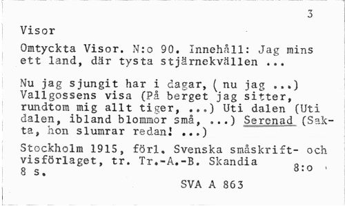 //// T //// O //// Visor //// Omtyckta Visor. N:o 90. Innehåll: Jag mins ett land, där tysta stjärnekvällen ... //// Nu jag sjungit har i dagar, (nu jag ...) Vallgossens visa (På berget jag sitter, rundtorn mig allt tiger, ...) Uti dalen (Uti dalen, ibland blommor små, ...) Serenad, (Sakta, hon slumrar redan! ...) //// Stockholm 1915, förl. Svenska småskrift- och visförlaget, tr. Tr.-A.-B. Skandia H 8 s " //// SVA A 86 3 ////