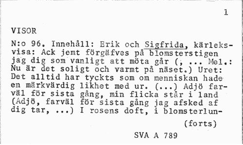 //// 1 //// VISOR //// N:o 96, Innehåll: Erik och Sigfrida, kärleksvisa: Ack jemt förgäfves på blomsterstigen jag dig som vanligt att möta går (, ... Mel.: Nu är det soligt och varmt på näset O IJret: Det alltid har tyckts som om menniskan hade en märkvärdig likhet med ur. (...) Adjö farväl för sista gång, min flicka står i land (Adjö, farväl för sista gång jag afsked af dig tar, ...) I rosens doft, i blomsterlun- //// (forts) //// SVA A 789 ////