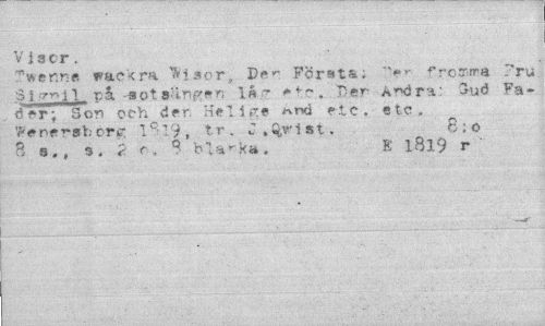 //// Viger. //// vackra Visor, D«r Första; *>r frosrm* 7ru //// S i ¦•"»11, på -aot 8.'inp«»n 1» - . TVer A^ra: Gud Fa- //// d er; Son och der. Helige etc. etc. //// Weneraborg lS'9, tr . J .Q,vl st, 8:0 //// B s., s. ? r, 0 blanka. E lBl9 r //// ."' ¦—¦Mit' ////