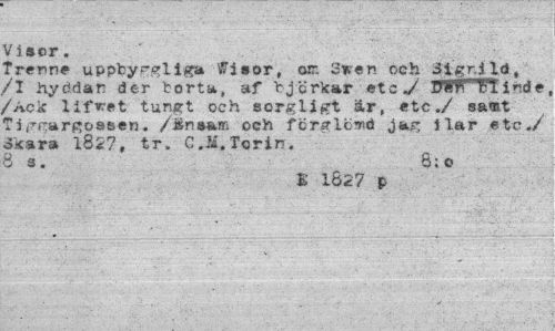 //// Viser. //// Trenne uppby roliga Visor, or. 3w en och ilgr i ld t /I hyddan der borta, af "bjcrkar etc./ lIltwTIiride, /Ack lifvret tunsrt och sorgligt är, etc./ samt Ti/TRarffosseB. /Änsam och fcra-lowd jajr ilar etc,/ Skara l8i7, tr. C.M.Tcrln. 8 s. 8;o //// E 1827 p ////