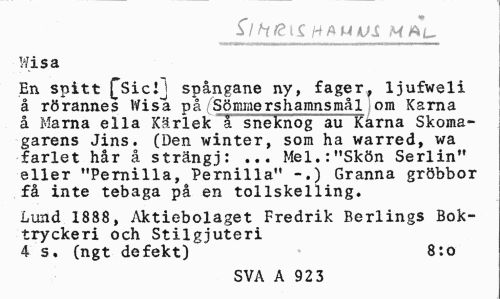 //// f/frgtS ftfihkjji MAL. //// Wisa //// En spitt ^Siclj spångane ny, fager, ljufweli å rörannes Wisa på Sömiaershamnsmål jom Karna å Marna ella Kärlek å sneknog au Karna Skoma-garens Jins. (Den winter, som ha warred, wa farlet hår å strängj: ... Mel.:"Skön Serlin" eller "Pernilla, Pernilla" -.) Granna gröbbor få inte tebaga på en tollskelling. //// Lund 1888, Aktiebolaget Fredrik Berlings Boktryckeri och Stilgjuteri //// 4 s. (ngt defekt) 8:0 //// SVA A 923 ////