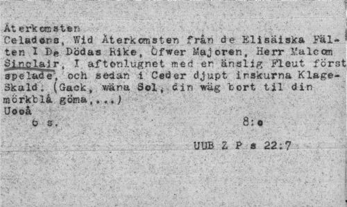 //// Återkomsten //// Celadono, Wid Återkomsten från de Elisaiska Fälten I B* Dödas Rike, öfwer Majoren, Herr Kale cm Slnclajr I af t onlug.net med er änslig Fleut fÖrs1 spelade, och sedan i Ceder djupt inskurna Klage-Skald; (Gäck, wäna Sol, cin wäg bort til din mörkblå göma,. ..) Uooå //// 6 s. 8; o //// UUB Z P a 22:7 ////