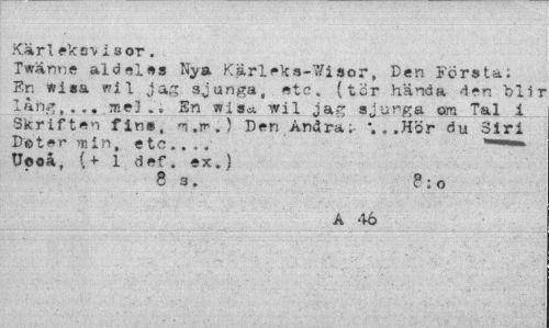 //// Kärleks\i »or. //// Twänne aldeles Nya Kärleks-"?/! sor, Den Första; En «i«a vi 1 jag sjunga, etc. (ter hända der bli i lahg, .., me] .. En »Isa. wil jag sjunga om Tal 1 Skriften flno, m^. > Den Andra;- *. . .Hör du 3iri D"éter min, etc..,. " //// Upoå, (+ 1 def. ex.) //// 8 a. 8 : o //// A 46 ////