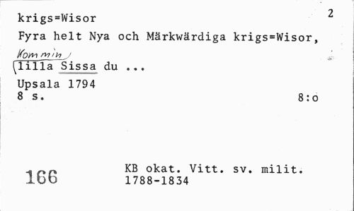 //// 2 //// krigs=Wisor //// Fyra helt Nya och Märkwärdiga krigs=Wisor, //// Kom wh,/ //// S^lilla Sissa du ... Upsala 1794 //// 8 s. 8:o //// KB okat. Vitt. sv. milit. Ibb 1788-1834 ////