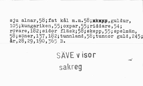 //// sju alnar,58; fat kål m.m.58;xks??s,gulcLur, 105{kungariken,55;oxpar,55;riddare,54; rövare,182;sidor fläsk;58;skepp,55» spelmän, 58;söner,137,182;tunnland,58;tunnor guld,245i //// år,28,29,190,365 B. //// SÄVE visor sakreg ////