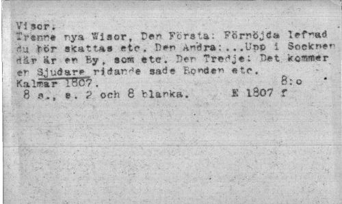 //// Vi »or. //// 1'renre nya lisor, Ver Företa: Förnöj<5a lef^ad //// tör skattas etc. Den Andra: .. .Utmd i Socknen när är en By ,' som etc. Ber Tredje; Det. kommer //// Sj ud a re ridande sade Börder etc. Kalmar 1HC7 . 8;o //// 8 s., e . ? och 8 blanka. £ lS07 f ////