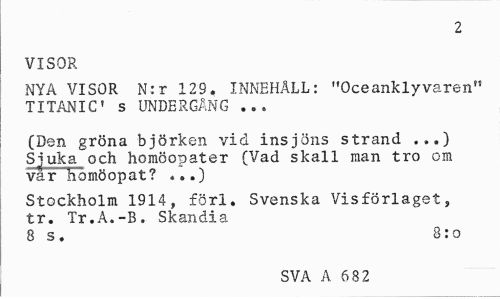 //// 2 //// VISOR //// NYA VISOR N:r 129. INNEHÅLL: "Oceanklyvaren" TITANIC' s UNDERGÅNG ... //// (Den gröna björken vid insjöns strand ...) Sjuka och homöopater (Vad skall nan tro om var homöopat? ...) //// Stockholm 1914, förl. Svenska Visförlaget, tr. Tr.A.-B. Skandia //// 8 s. 8:o //// SVA A 682 ////