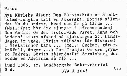 //// Wisor //// Nya Kärleks Wisor: Den Förs ta:Från en Stock-holras=Jung£ru till en Kokerska. Börjas sålunda: Nu du undrar, hwad som är på färde ... (Mel.:Tyst hör det sjunger i aftonstunden) Den Andra: Om det trolofwade Paret. Anna och Anders1 sista afsked på sjuksängen S:t Handsdagen år 1864• Börjas sålunda: Lär älskarej I älskarinnor kära ... (Mel.: Suckar, tårar, knäfall, ånger Den Tredje: Om den grym- //// me Fadren. Börjas sålunda:Uti Stralsburg der bodde en Adelsman så rik ... //// Lund 1865, tr. Lundbergska Boktryckeriet //// 8 s* SVA A 1042 8:0 ////