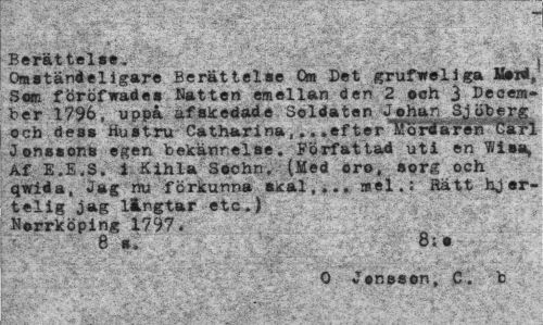 //// | Berättelse. ' " M' //// Om s t ä nå e11gare Berättelse O» Det grufwoliga IS»vå Som föröfwade» Hatten emellan den 2 och 3 December 1796, uppå af skedade Soldaten Johan Sjöberg och dess Hustru Catharina,. . .efter (Jonssons egen bekännelse. Författad uti en Wisa Af E.E.S. i Kihla Sochn. (Med oro, sorg och qwiåa, Jag nu förkunna s*al,... »el.; Hatt hj or-telig jag långtar etc.) Norrköping 1797. //// 8 s. 8:o //// O Jonsson, C. b ////