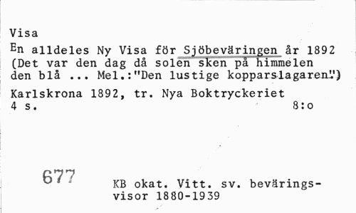 //// Visa //// En alldeles Ny Visa för Sjöbeväringen år 1892 (Det var den dag då solen sken på himmelen den blå ... Mel.:"Den lustige kopparslagarenV) //// Karlskrona 1892, tr. Nya Boktryckeriet 4 s. 8:o //// pqi KB okat. Vitt. sv. bevärings- //// bOl visor 1880-1939 ////