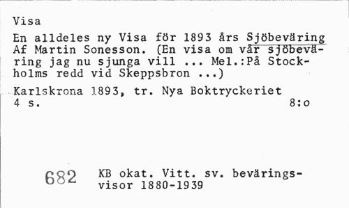 //// Visa //// En alldeles ny Visa för 1893 års Sjöbeväring Af Martin Sonesson. (En visa om vår sjöbeväring jag nu sjunga vill ... Mel.:På Stockholms redd vid Skeppsbron ...) //// Karlskrona 1893, tr. Nya Boktryckeriet 4 s. 8:o //// O KB okat. Vitt. sv. bevärings-u ^ visor 18 80-19 39 ////