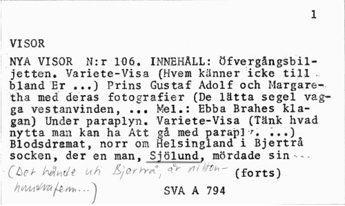 //// 1 //// VISOR //// NYA VISOR N:r 106. INNEHÅLL: öfvergångsbil-jetten. Variete-Visa (Hvem känner icke till bland Er ...) Prins Gustaf Adolf och Margaretha med deras fotografier (De lätta segel vagga vestanvinden, ... Mel.: Ebba Brahes klagan) Under paraplyn. Variete-Visa (Tänk hvad nytta man kan ha Att gå med parap] ...)0 Blodsdramat, norr om Helsingland i Bjertrå socken, der en man, Sjölund, mördade sin---A*W< uK £>jerhr*Ct ^ /tilfoh- (forts) //// hiAM^t^y^,) SVA A 794 ////