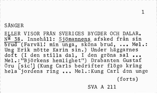//// x //// SÅNGER //// ELLER VISOR FRÄN SVERIGES BYGDER OCH DALAR. N= 38. Innehåll: S-jömannens afsked från sin brud (Farväli min unga, sköna brud, ... Mel.: Ung Erik mötte Karin sin.) Under häggarnes doft (I den stilla dal, I den gröna sal ... Mel.:"Björkens hemlighet") Drabanten Gustaf öru [siclj (Kung Carls bedrifter flögo kring hela jordens ring ... Mel.:Kung Carl den unge //// (forts) //// SVA A 211 ////