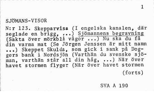 //// 1 //// SJÖMANS-VISOR //// N:r 123. Skepparvisa (I engelska kanalen, där seglade en brigg» ,..) Sjömannens begravning (Sakta över mörkblå vågor .",'.) Nu ska du få din varma mat (Se Jörgen Jenssen är mitt namn ...) Skeppet Skulda, som gick i sank på Dog-gers bank i Nordsjön (Varthän du svenske sjöman, varthän står all din håg, ...) När över havet stormen flyger (När över havet stormen //// (forts) SVA A 190 ////