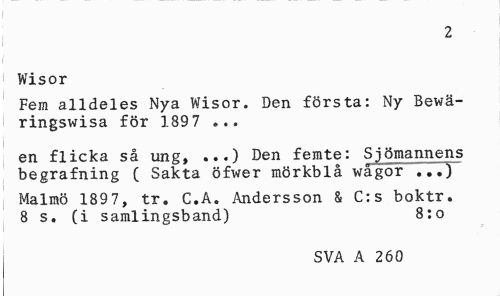 //// 2 //// Wisor //// Fem alldeles Nya Wisor. Den första: Ny Bewä-ringswisa för 1897 ... //// en flicka så ung, ...) Den femte: Sjömannens begrafning ( Sakta öfwer mörkblå wågör ...) //// Malmö 1897, tr. C.A. Andersson & C:s boktr. 8 s. (i samlingsband) 8:o //// SVA A 260 ////